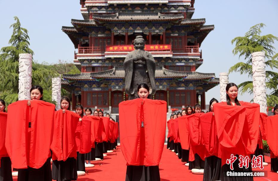 4月17日,河南永城芒碭山旅游區(qū)夫子山孔子像前,數(shù)十名女子身著漢服重新按照中國古禮參加女子成人大典,隨著現(xiàn)場古韻悠長的禮樂響起,姑娘們經(jīng)過及笄禮、簪拜之禮等議程完成自己的成人禮,致敬傳統(tǒng)文化禮儀。中新社記者王中舉攝