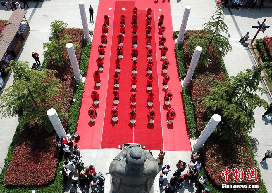 4月17日,河南永城芒碭山旅游區(qū)夫子山孔子像前,數(shù)十名女子身著漢服重新按照中國古禮參加女子成人大典,隨著現(xiàn)場古韻悠長的禮樂響起,姑娘們經(jīng)過及笄禮、簪拜之禮等議程完成自己的成人禮,致敬傳統(tǒng)文化禮儀。中新社記者王中舉攝
