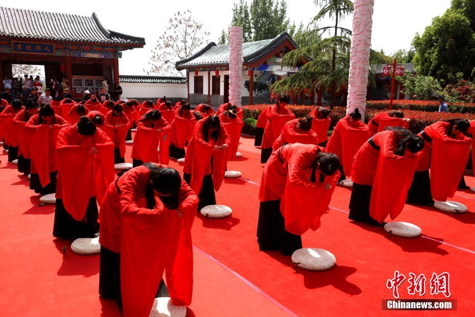 4月17日,河南永城芒碭山旅游區(qū)夫子山孔子像前,數(shù)十名女子身著漢服重新按照中國古禮參加女子成人大典,隨著現(xiàn)場古韻悠長的禮樂響起,姑娘們經(jīng)過及笄禮、簪拜之禮等議程完成自己的成人禮,致敬傳統(tǒng)文化禮儀。中新社記者王中舉攝