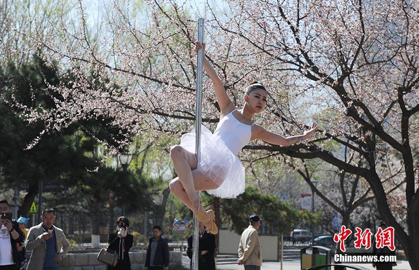 4月25日,長春市杏花村公園內(nèi)杏花綻放,幾名舞者在公園內(nèi)跳起鋼管舞,吸引市民觀看。劉棟攝