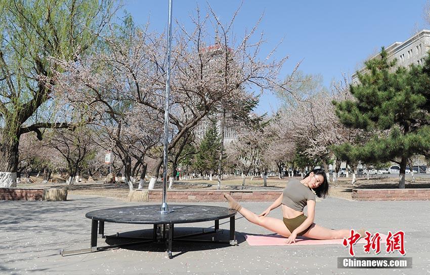 鋼管舞者杏花樹下展示力與美