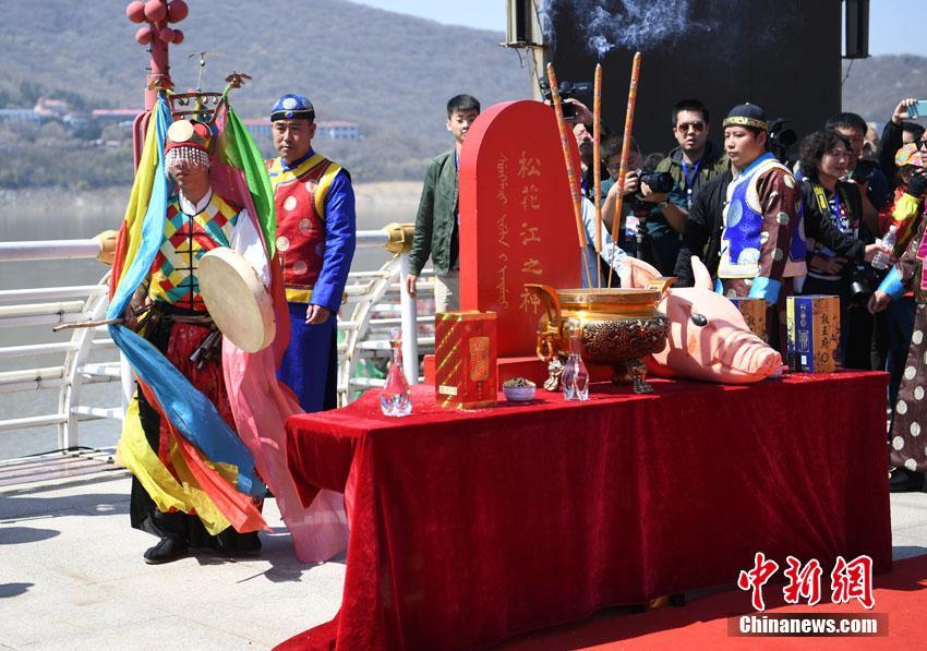 4月25日,一場具有滿族特色的“醒網(wǎng)大典”在吉林市松花江畔上演。46名身穿滿族傳統(tǒng)服飾的祭祀人員高舉魚型神偶、柳樹神具,身披漁民披肩為游客重現(xiàn)古老的開江捕魚祭禮儀式。當(dāng)天,第13屆吉林市開江魚美食節(jié)拉開帷幕。張瑤攝