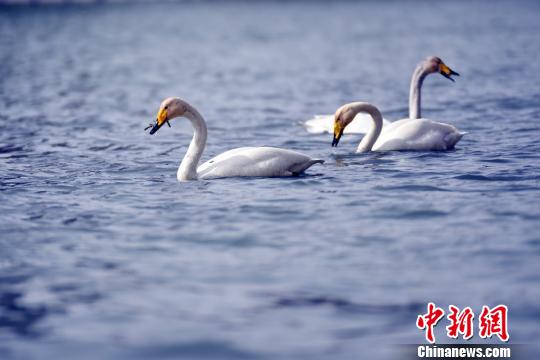 在庫爾勒市區(qū)的天鵝正在覓食水草?!⊥魸z
