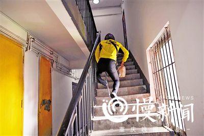 第二單在渝北區(qū)大竹林慈竹苑小區(qū),陳超不陌生,因?yàn)樽约鹤獾姆孔泳驮诟浇?樓,無電梯。陳超左臂架拐作支撐,右手提著水果,右腿大步向前躍,緊隨其后的我們有點(diǎn)氣喘吁吁,差點(diǎn)跟不上他的步伐。