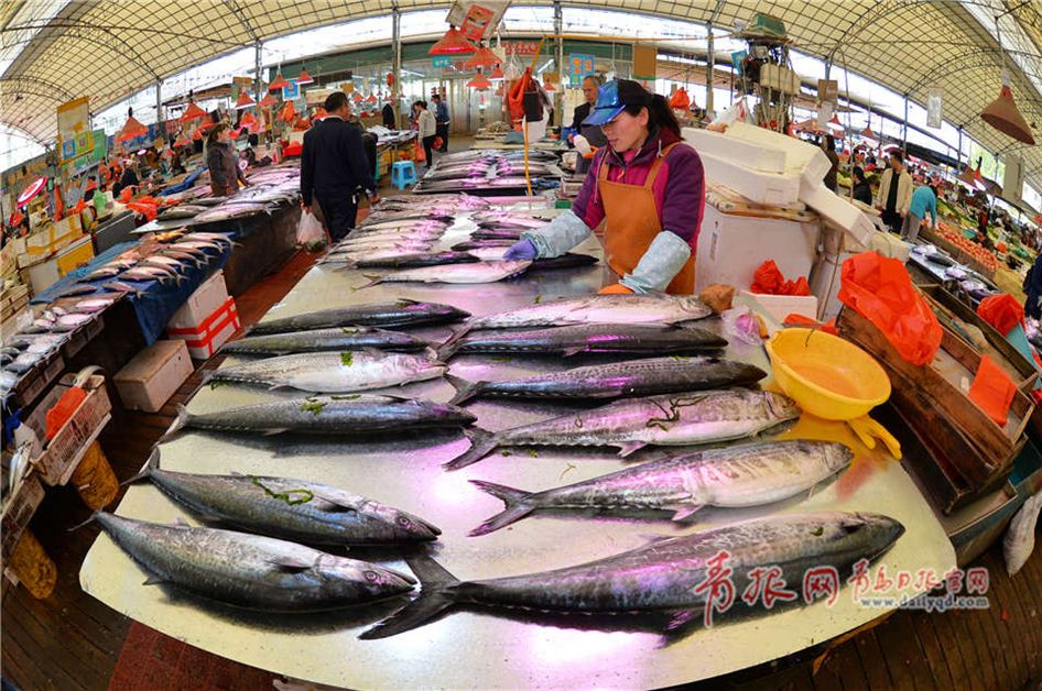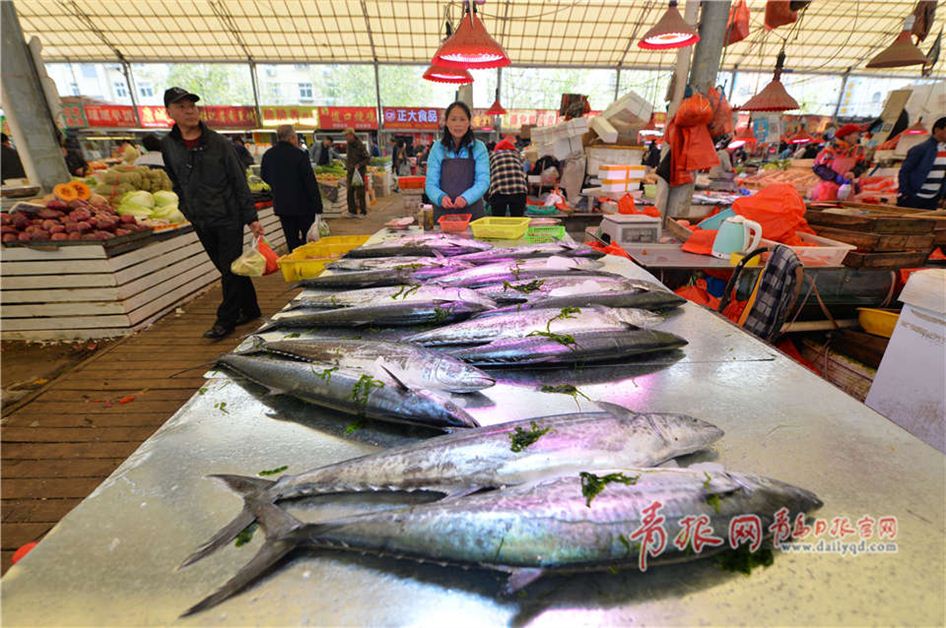 擺放在青島市北一處海鮮市場上的春鲅魚。