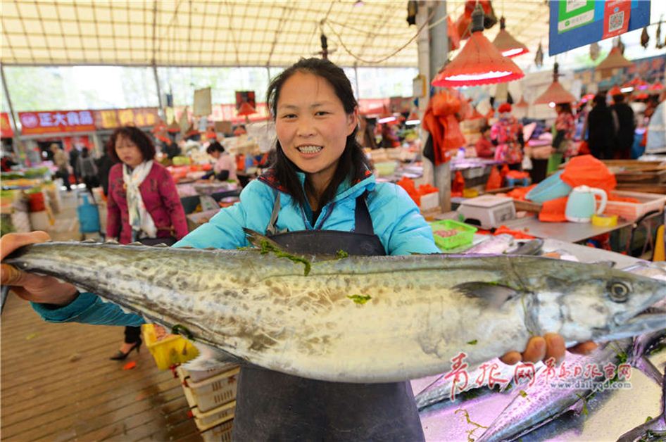 休漁期開始,青島市北一處海鮮市場春鲅魚熱銷,價(jià)格平穩(wěn)。銷售者在青島海鮮市場為顧客展示春鲅魚。