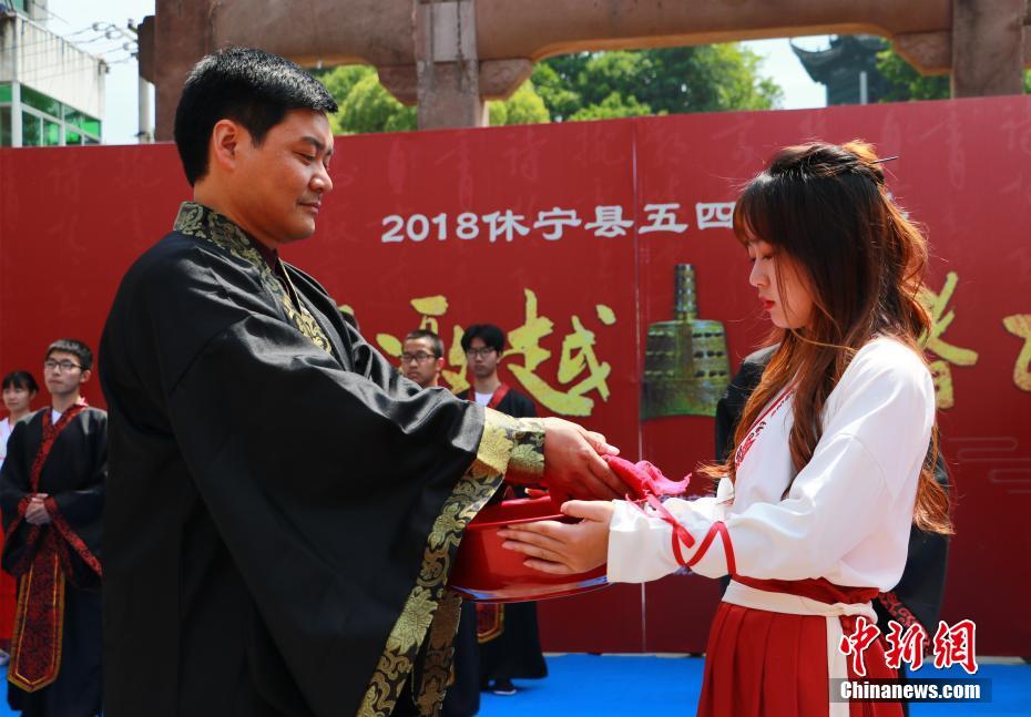 據(jù)了解,冠笄之禮是漢民族傳統(tǒng)的成人儀禮,也是重要的人文遺產(chǎn)。男子的成人禮稱作冠禮,女子的成人禮稱作笄禮。圖為正賓在沃盥。 (文字張婭子/圖陳佳)