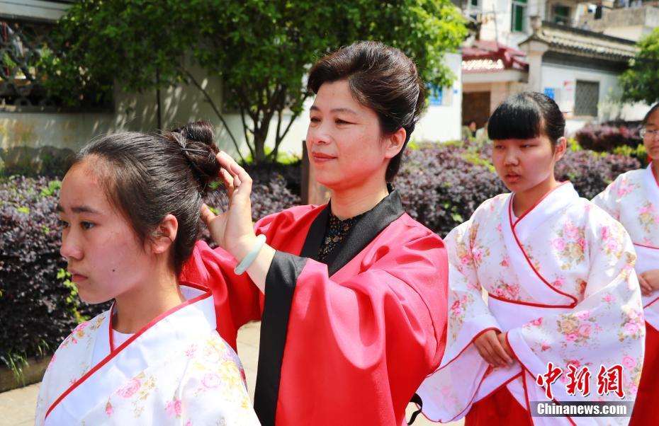休寧縣自古文風昌盛、人文厚重,以歷史上相繼走出19名文武狀元而居全國各縣之首,是“中國狀元文化之鄉(xiāng)”。圖為正賓為受禮者挽簪。 (文字張婭子/圖陳佳)