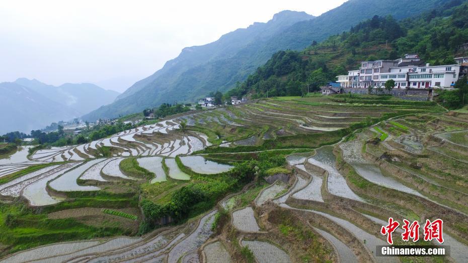 5月9日,堯龍山梯田高低錯落,周圍有房屋和樹木點綴。堯龍山梯田位于貴州省遵義市桐梓縣堯龍山鎮(zhèn)。中新社發(fā)瞿宏倫攝