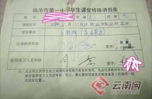 5月13日,網(wǎng)友“徹尾的絕望”在社交平臺上發(fā)布了一張?zhí)厥獾摹罢埣贄l”,引起網(wǎng)友們的關(guān)注。翻拍照片顯示了一張標題為“臨滄市第一中學學生課堂特殊請假條”的紙張,其請假事由一欄寫有“上廁所(尿非常急)”字樣。請假條還需要任課老師審批、值班保衛(wèi)人員審核簽字,并且還需填寫請假的起止時間,網(wǎng)友在曝料微博文中表示,“每天還只有100張請假條,先到先得”。此請假條下方寫有“此證明僅供學生在上課期間請假離開教室時使用,最后要將假條放在教室備查(班級統(tǒng)一掛在固定位置)。“上廁所也需要寫請假條?”網(wǎng)友紛紛留言認為這樣的請假條”不合理“。