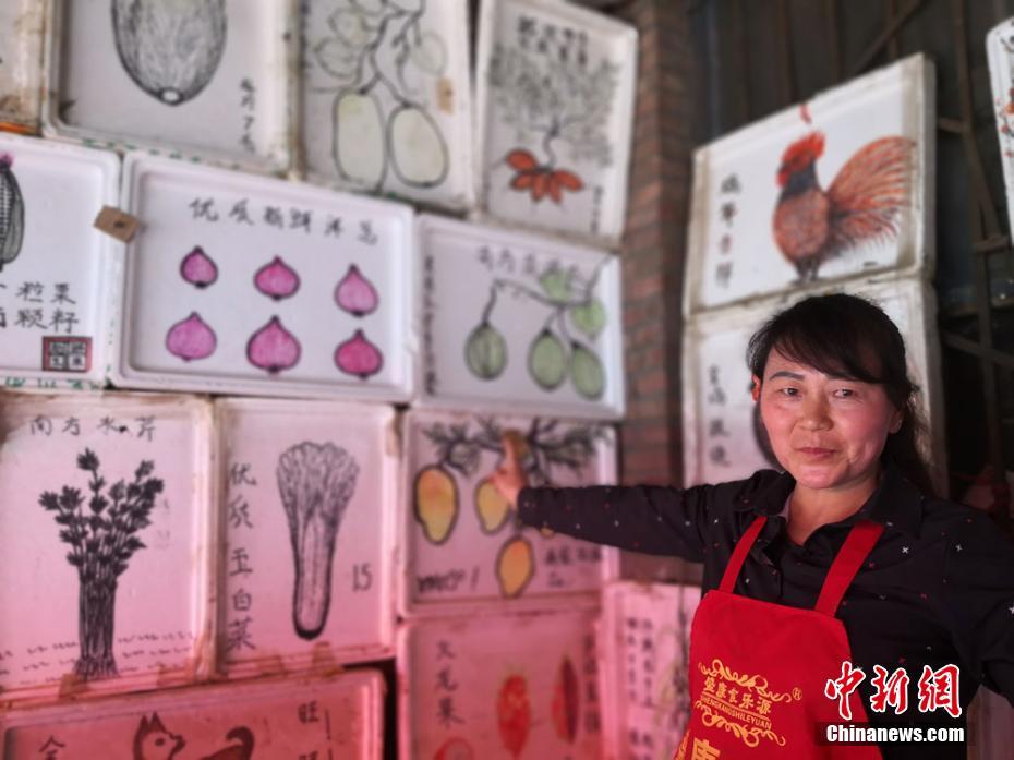 胡二玲將蔬菜畫(huà)在泡沫上,并標(biāo)明價(jià)格等,供顧客挑選。 楊娜 攝
