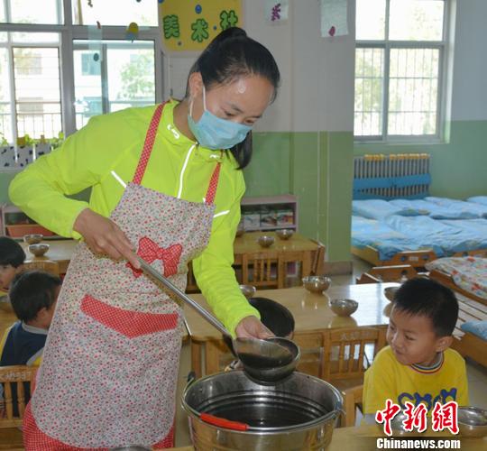甘肅臨夏回族自治州永靖縣太極幼兒園內(nèi),老師正在為小朋友盛飯。 郭紅 攝