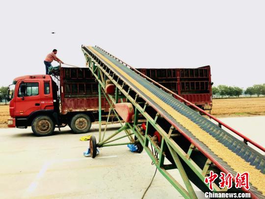 圖為傳送帶將分揀好的麥粒送進(jìn)車廂。目前,整個黃泛區(qū)農(nóng)場的作物耕種收割綜合機(jī)械水平已經(jīng)達(dá)到99%。 韓章云攝