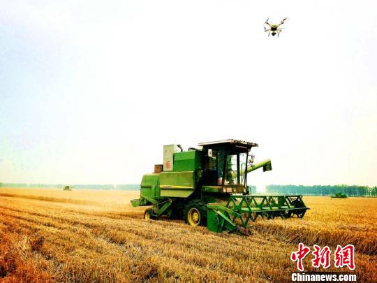 一架無人機(jī)飛過正在作業(yè)的收割機(jī)上空?!№n章云攝