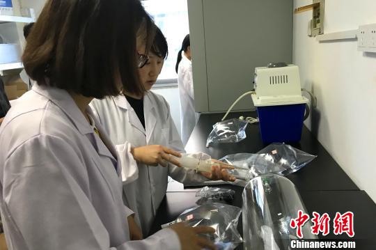 嗅辨員將樣品氣體取樣到透明塑料袋中 董曉斌 攝