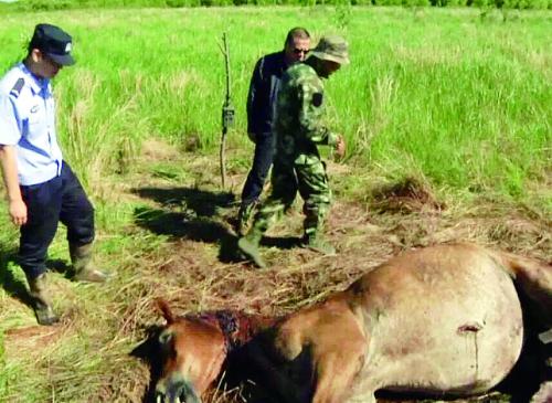 據(jù)農(nóng)墾八五九農(nóng)場轄區(qū)東安鎮(zhèn)三道壩馬場主人王新剛講,8日早上,負(fù)責(zé)管護(hù)馬匹的李凱忠?guī)煾翟谀榴R時發(fā)現(xiàn)少了一匹馬,結(jié)果發(fā)現(xiàn)它在草場上竟被咬死了。當(dāng)時,這匹成年馬頸部咬痕抓痕累累,一條后腿部的肉被啃光。同時,地面上還留有大型動物的足跡,懷疑有大型猛獸在半夜進(jìn)入馬場將馬咬死,立即報警。