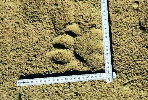 生活報記者了解到,在通往馬場的路上也出現(xiàn)疑似東北虎的足跡,專家對此進(jìn)行勘查。孫主任告訴記者,事發(fā)當(dāng)天正好剛下過雨,老虎的足跡得以清晰保留。從掌墊兒上來看,可以判斷它是一只雄性東北虎。