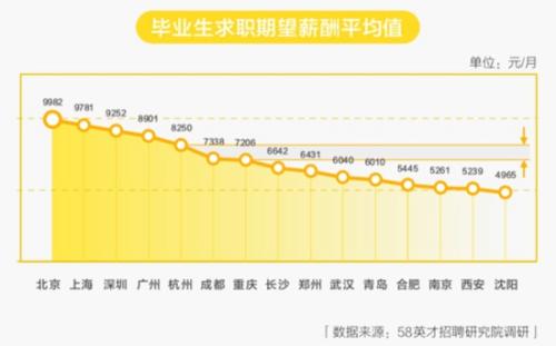 另外,因一線城市生活成本和薪資水平高,畢業(yè)生期望薪酬也相對較高。北京求職的畢業(yè)生期望薪酬排名第一,達到9982元/月。