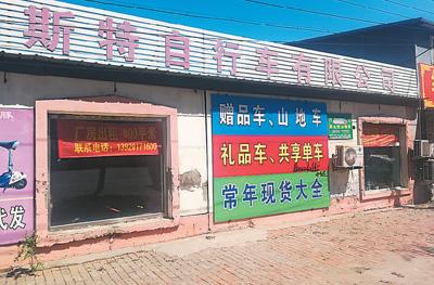 天津市武清區(qū)王慶坨鎮(zhèn)曾以生產(chǎn)共享單車聞名,如今鎮(zhèn)上店面內(nèi)已難覓共享單車的蹤影。圖為路邊貼著共享單車標(biāo)語(yǔ)的自行車店,店內(nèi)空無(wú)一人,櫥窗玻璃上貼著“廠房出租”的字樣。(本報(bào)記者孔德晨攝)