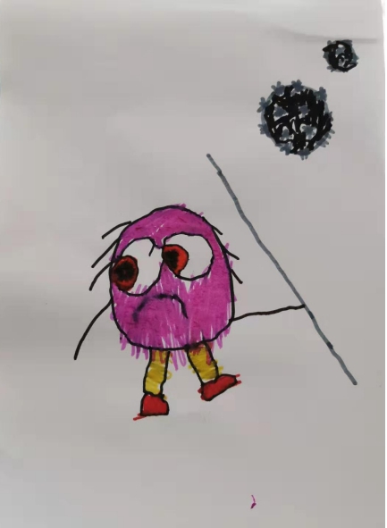 每天晚上工作完回到住的地方,愛(ài)人就會(huì)和我視頻,讓我看看孩子,說(shuō)孩子很想爸爸,總是問(wèn)她爸爸去哪了?她就告訴孩子說(shuō)爸爸去打病毒去了,孩子就說(shuō)那我也要幫爸爸打病毒。有一天我回去,孩子視頻告訴我她畫了一幅畫,就是下面的這幅畫,她說(shuō)她拿著棍子要把病毒打走,這樣爸爸就能早點(diǎn)回家了。我聽(tīng)后眼淚在眼睛里打轉(zhuǎn),我告訴孩子爸爸一定會(huì)努力戰(zhàn)勝病毒,早日回家!