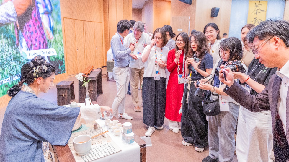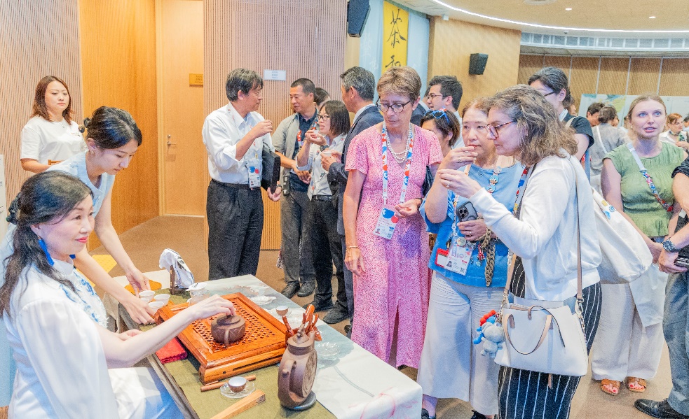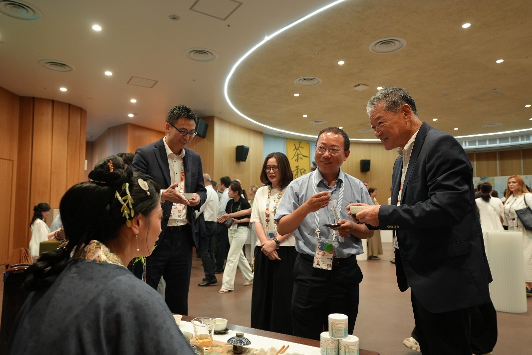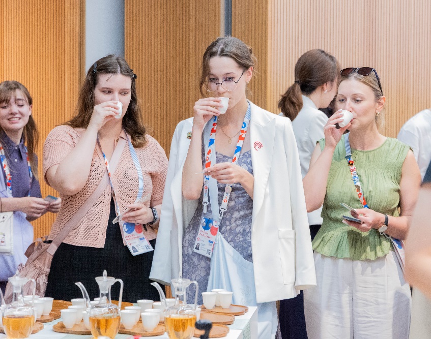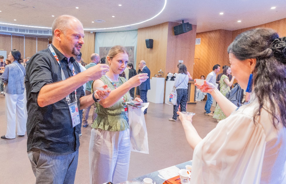 來自各國的嘉賓們在輕松愜意的氛圍中,以英語、日語或各自的母語品茗交談,或探討茶藝文化,或分享本國茶飲傳統(tǒng)。雖言語未必相通,但茶香無聲傳情。茶香與笑語交織,盡顯東方飲食文化的精致與溫情,現(xiàn)場氣氛溫馨熱烈。