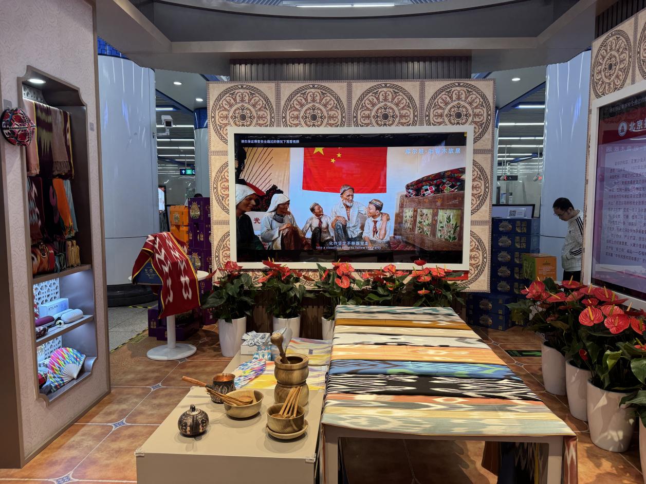 這座“城市客廳”以“一站一廳一景”設(shè)計(jì),吸引了眾多地鐵里匆匆趕路的行人。一位市民走到展臺(tái)前,拿起艾德萊斯紋樣的文創(chuàng)扇感慨道:“正打算國慶去新疆玩,沒想到在地鐵里就提前看到了和田特色,感受到了‘新疆風(fēng)情’”。