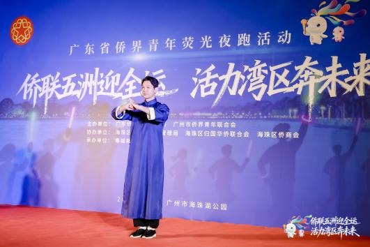 夜幕初垂,海珠湖畔熒光點點。活動在熱烈的簽到與熒光裝備發(fā)放中拉開序幕,僑界青年們在主題背景板前合影留念,并在世界冠軍、中國田徑健將莫有雪的帶領(lǐng)下進行熱身,現(xiàn)場氣氛迅速升溫。