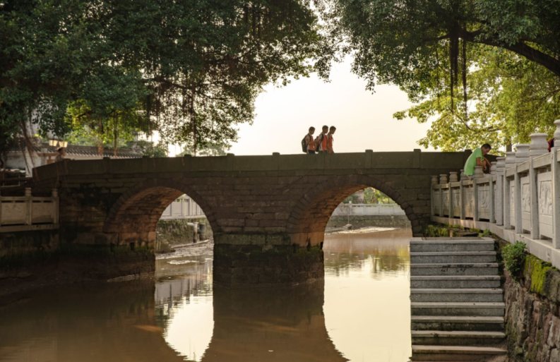 橫跨玉帶河的龍津橋,是“文房四寶”中的“筆架”。始建于清康熙年間的石拱橋,以紅砂巖石砌筑,東西兩側(cè)設(shè)有引橋,欄板上的花卉紋樣歷經(jīng)百年風(fēng)雨仍清晰可辨。站在橋頭遠(yuǎn)眺,橋洞與水中倒影構(gòu)成完整圓形,恰似飽蘸墨汁的毛筆,古時(shí)村民與考生常在此祈福,期盼“一躍龍門”。