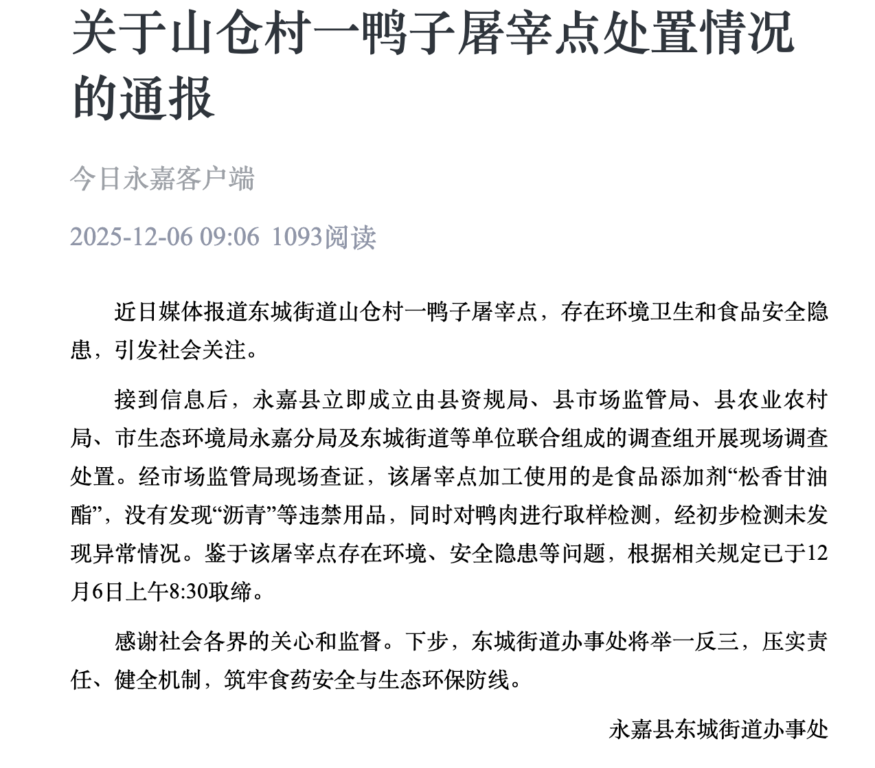 12月5日,潮新聞報道了溫州市永嘉縣東城街道山倉村一鴨子屠宰點存在環(huán)境衛(wèi)生和食品安全隱患的問題,隨即引發(fā)多方關(guān)注。