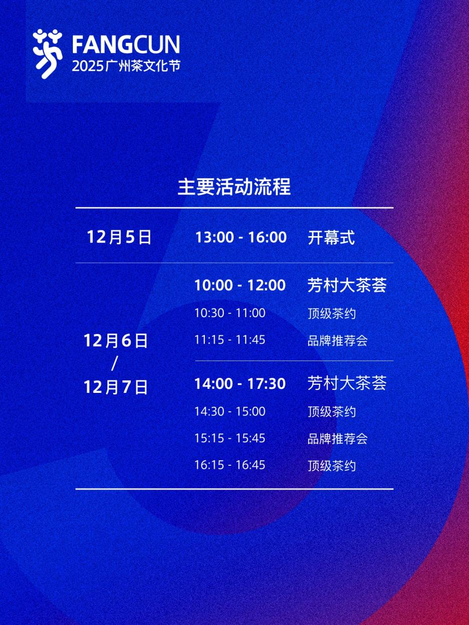 作為2025廣州茶文化節(jié)的重磅環(huán)節(jié),“芳村大茶薈”于2025年12月6日上午10時(shí)在廣東芳村茶業(yè)城正式開席,以茶香為媒搭建交流平臺(tái),邀各界茶友共赴這場(chǎng)味覺與文化的盛宴。