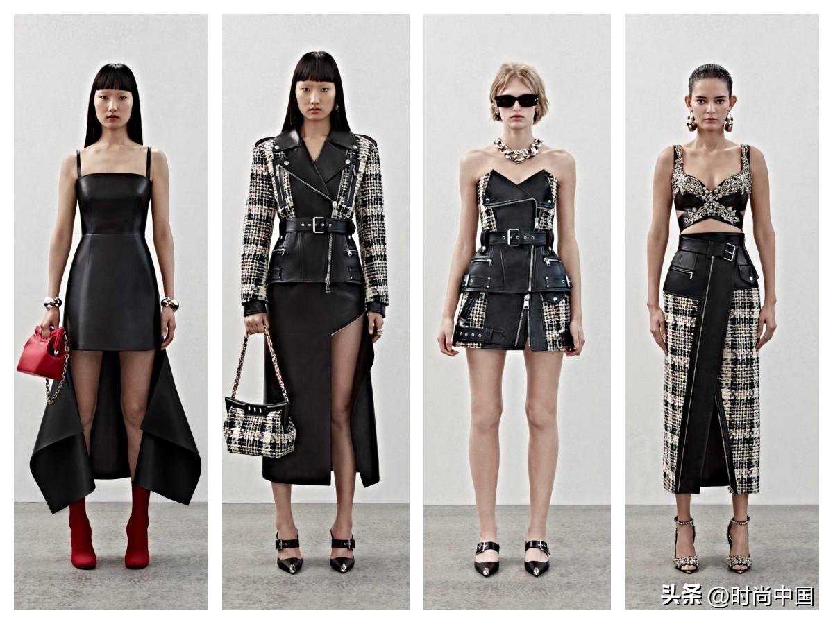 黑白色粗花呢、黑色皮革拼接機車夾克及黑色皮革切口設(shè)計機車裙。銀色金屬鞋尖黑色皮革Punk高跟穆勒鞋;
