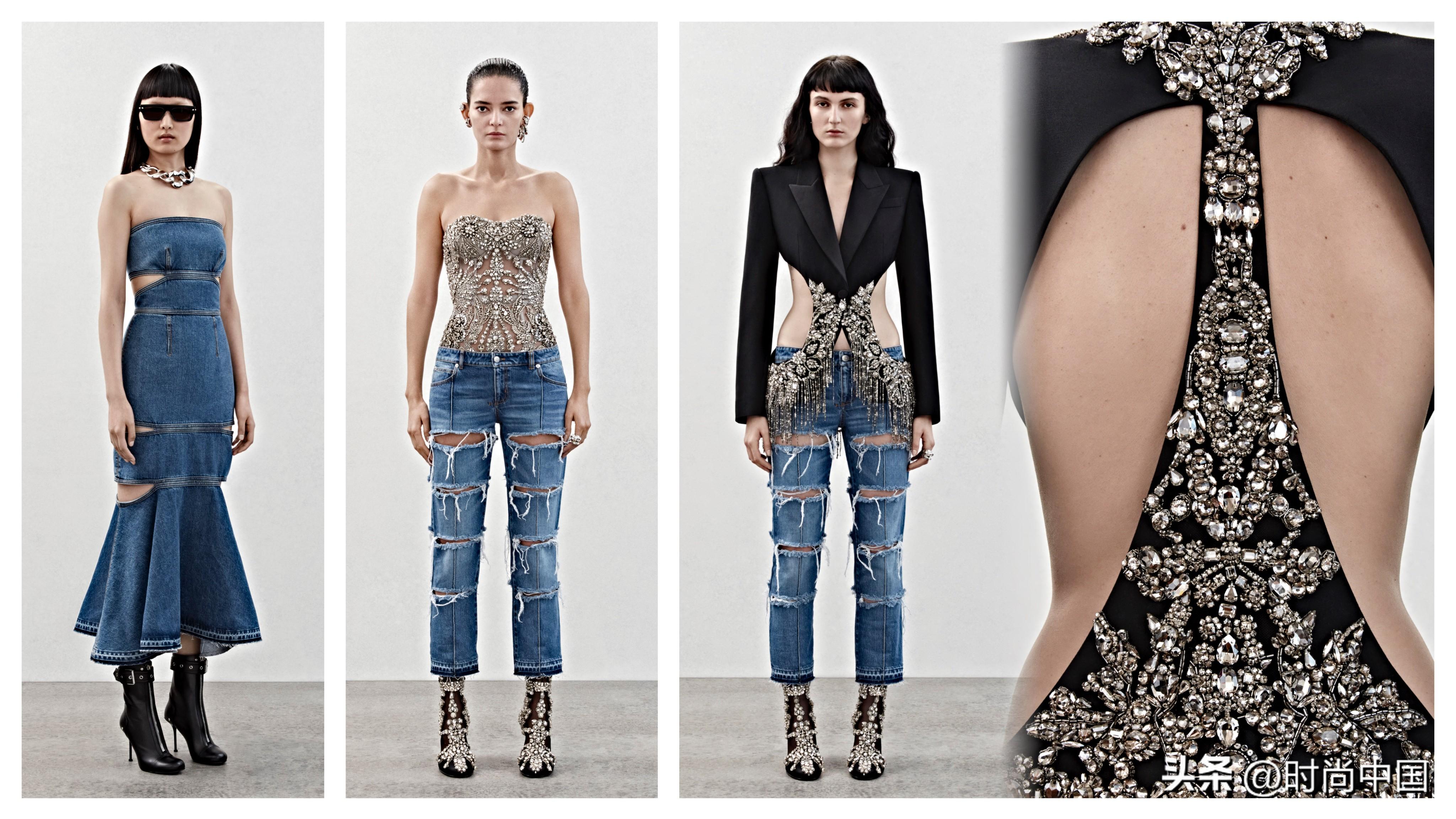 鏤空細(xì)節(jié)水晶刺繡單排扣精裁外套及藍(lán)色牛仔切口設(shè)計超低腰褲。以水晶刺繡裝飾的黑色粘膠針織襪靴。