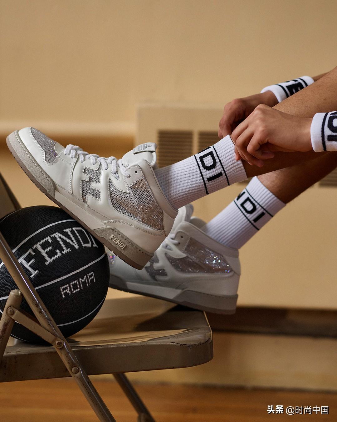 高幫版FENDI Match籃球鞋采用黑色與奶油色的經(jīng)典搭配,另有鑲嵌水晶的純白特別款。