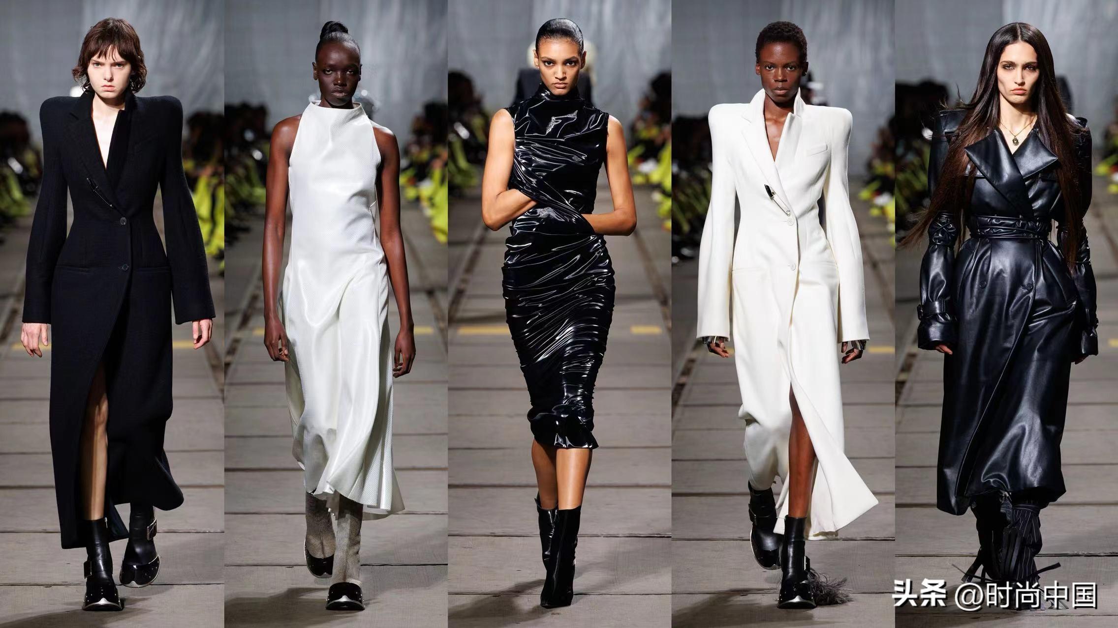 黑色皮革輕微填充風(fēng)衣外套,腰部、手部飾有捆綁細(xì)節(jié),黑、白色羊毛細(xì)條紋捆綁細(xì)節(jié)長褲。