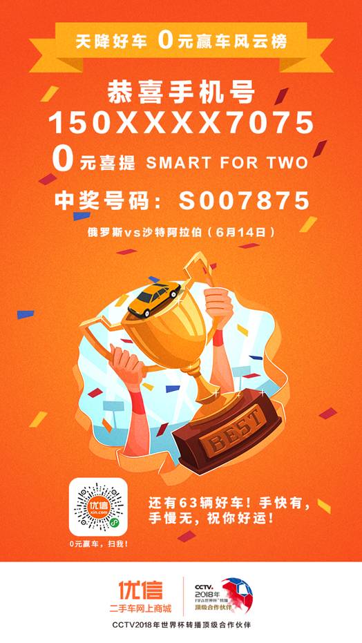 作為央視世界杯轉(zhuǎn)播頂級合作伙伴,優(yōu)信二手車在世界杯期間,推出了“當(dāng)燃現(xiàn)在 0元贏車”的驚喜福利互動,世界杯開幕當(dāng)天,首場比賽競猜就吸引了數(shù)萬人參與。其中有兩萬九千多人猜中俄羅斯勝,最終手機(jī)尾號7075的幸運(yùn)兒捧走了第一臺奔馳Smart大獎。優(yōu)信超大福利瞬間點(diǎn)燃全民參與熱情!