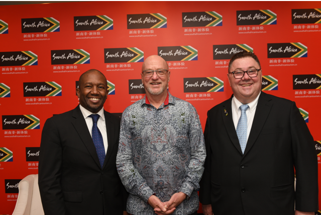 從左至右:南非旅游局首席執(zhí)行官Sisa Ntshona先生、南非國家旅游部部長Derek Hanekom先生、南非旅游局亞太區(qū)總裁白文博先生,在現(xiàn)場接受媒體采訪。