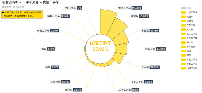 各家二手車(chē)電商產(chǎn)品和服務(wù)趨同化的今天,在消費(fèi)者中品牌心智份額表現(xiàn)在一定程度上反映了市場(chǎng)座次,這也是以產(chǎn)品服務(wù)為基礎(chǔ)的綜合競(jìng)爭(zhēng)力的體現(xiàn)。