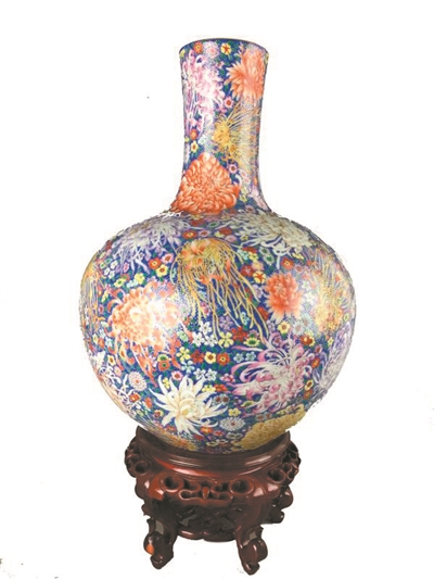 廣彩瓷瓶《灑金蘭地百菊圖》高52厘米,寬35厘米,在亮藍底色上,上百朵形態(tài)婀娜、色彩多姿的菊花爭奇斗艷。整件作品色彩鮮明,極富輝煌,具有典型的“萬縷金絲織白玉”廣彩風格。