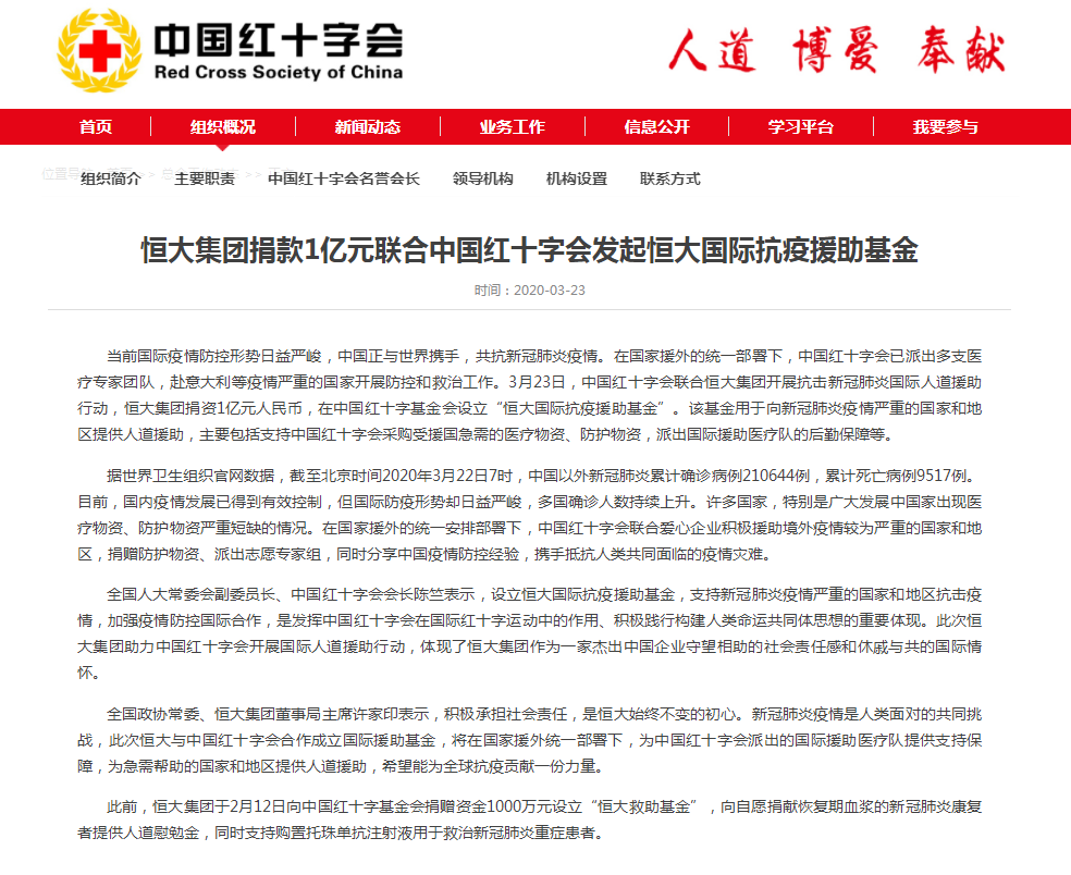 中國紅十字會(huì)與恒大集團(tuán)合作成立國際抗疫援助基金