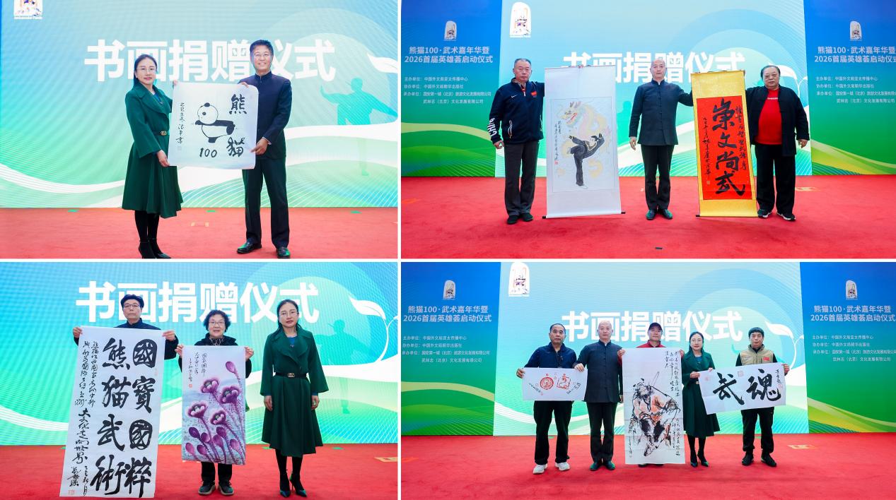 文化的力量,在武與文的交融中綻放。八位書畫名家現(xiàn)場捐贈作品,以筆墨表達(dá)對武術(shù)的支持。隨后,趙珺、張科、周亮等嘉賓共同按下啟動裝置,宣告“熊貓100?武術(shù)嘉年華暨2026首屆英雄薈”正式揚帆啟航。
