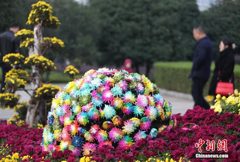 11月22日,在江西南昌第29屆菊花展上,一束束五顏六色的“七彩菊花”,十分吸引游客和市民的目光。據(jù)了解,七彩菊的生存環(huán)境比較講究,它需要在特別的光照、溫度下注入生物炫彩素,然后讓植物全身吸入色素,在花瓣上均勻展現(xiàn)。中新社記者劉占昆攝