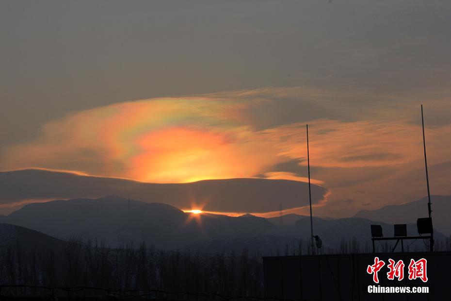 新疆天池出現(xiàn)五彩云霞 如羽翼般絢麗多彩