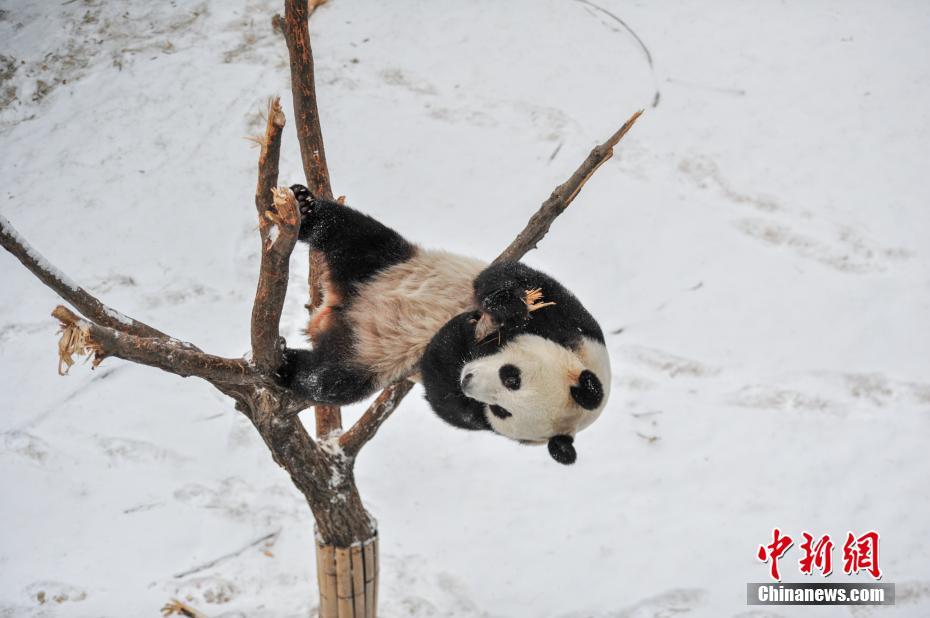 1月8日,遼寧沈陽迎來今年首場(chǎng)降雪,沈陽森林動(dòng)物園里的大熊貓打滾戲雪,樂享雪趣。中新社記者于海洋攝
