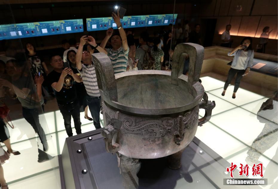 5月17日晚,國(guó)寶“獸面紋五耳鼎”引起觀眾極大興趣。當(dāng)日,為迎接第42個(gè)國(guó)際博物館日,陜西歷史博物館特面向公眾舉辦“絲路盛世”陜西歷史博物館之夜大型公益文化活動(dòng)暨基本陳列《陜西古代文明》新展覽開展活動(dòng)?!蛾兾鞴糯拿鳌氛褂[歷時(shí)十個(gè)月的論證、籌備、裝修、布展,于當(dāng)晚正式開放,展覽增加了近十年陜西考古新發(fā)現(xiàn)精品文物、吸收了當(dāng)代博物館最新陳列理念、采用了最新展示傳播手段。中新社記者張遠(yuǎn)攝