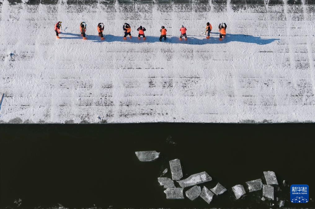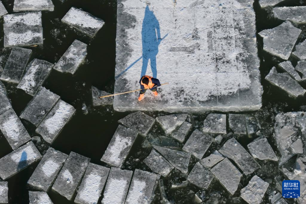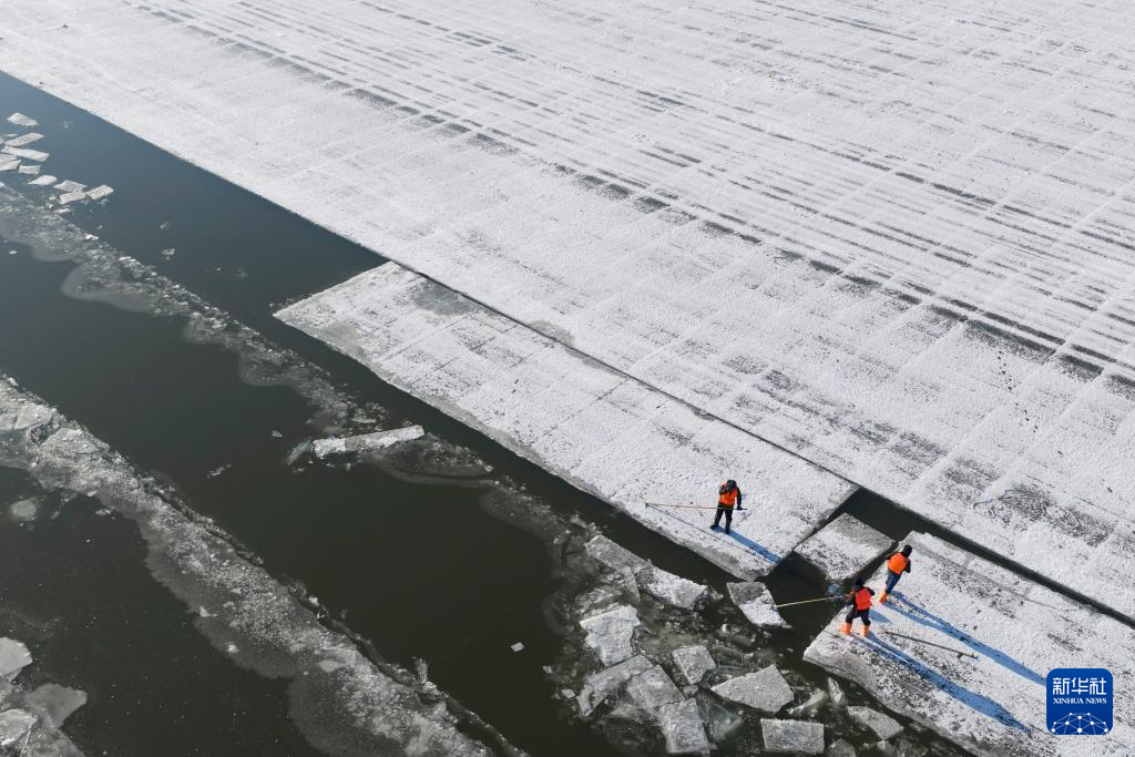 12月9日,工人在松花江哈爾濱段采冰(無人機(jī)照片)。