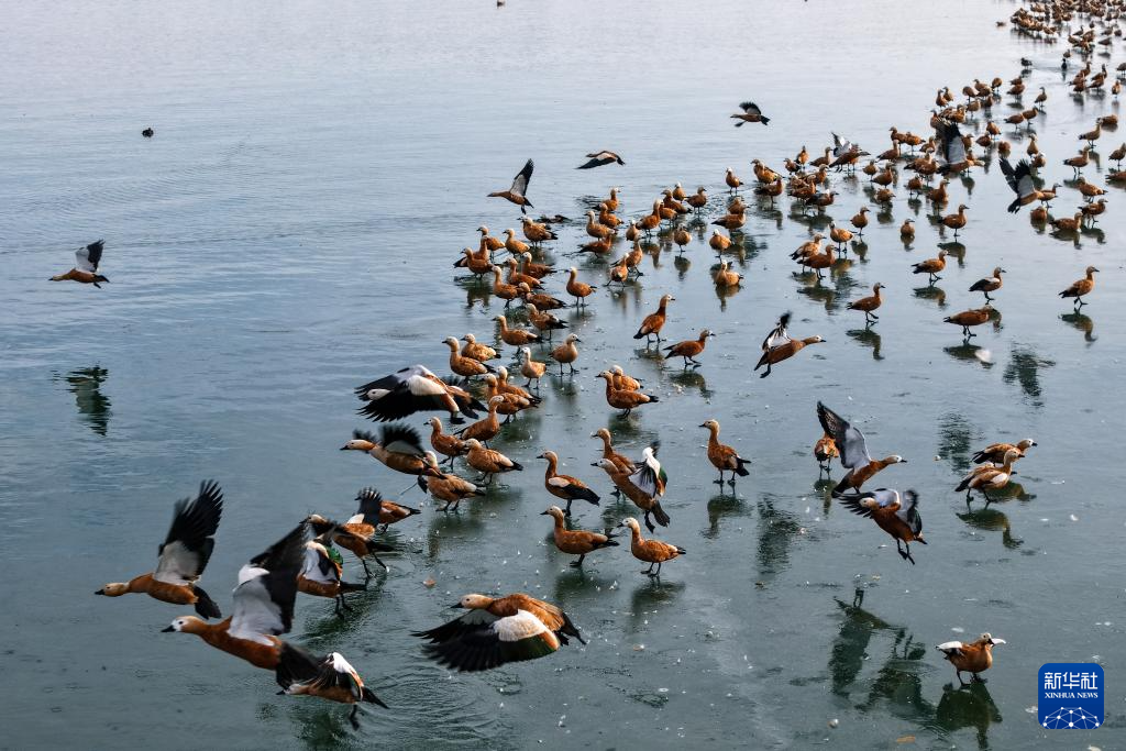 11月22日,在河西走廊東端的甘肅民勤石羊河國家濕地公園,一群赤麻鴨在紅崖山水庫活動覓食(無人機照片)。