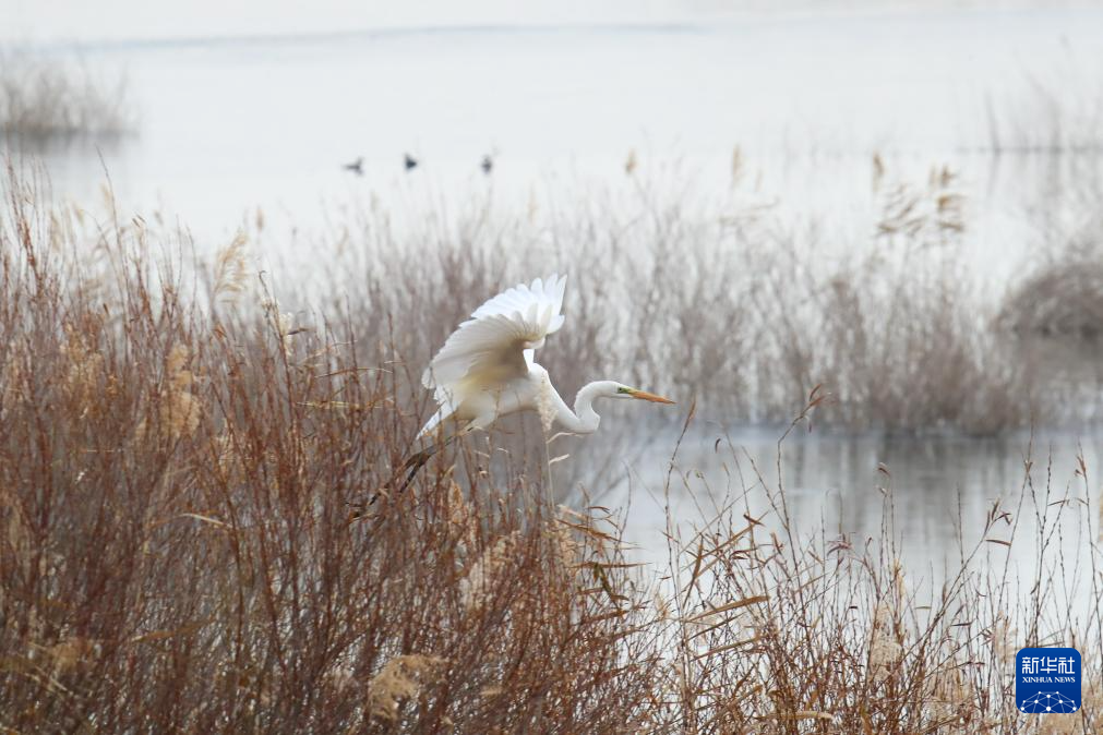 11月22日,在河西走廊東端的甘肅民勤石羊河國家濕地公園,大白鷺在紅崖山水庫飛翔。