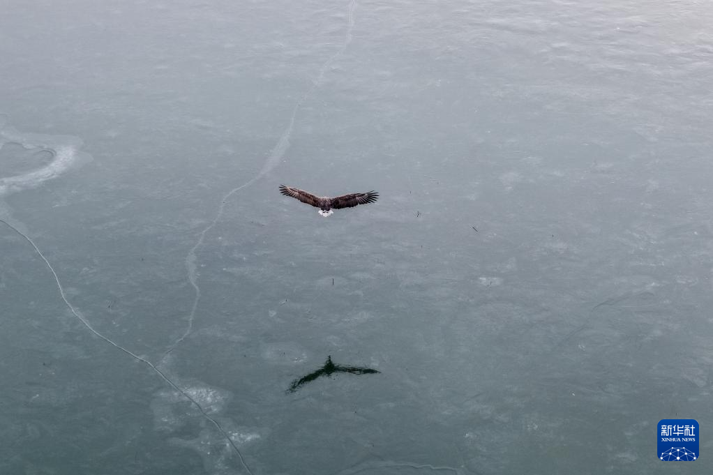 11月22日,在河西走廊東端的甘肅民勤石羊河國家濕地公園,國家一級保護野生動物白尾海雕在紅崖山水庫翱翔(無人機照片)。