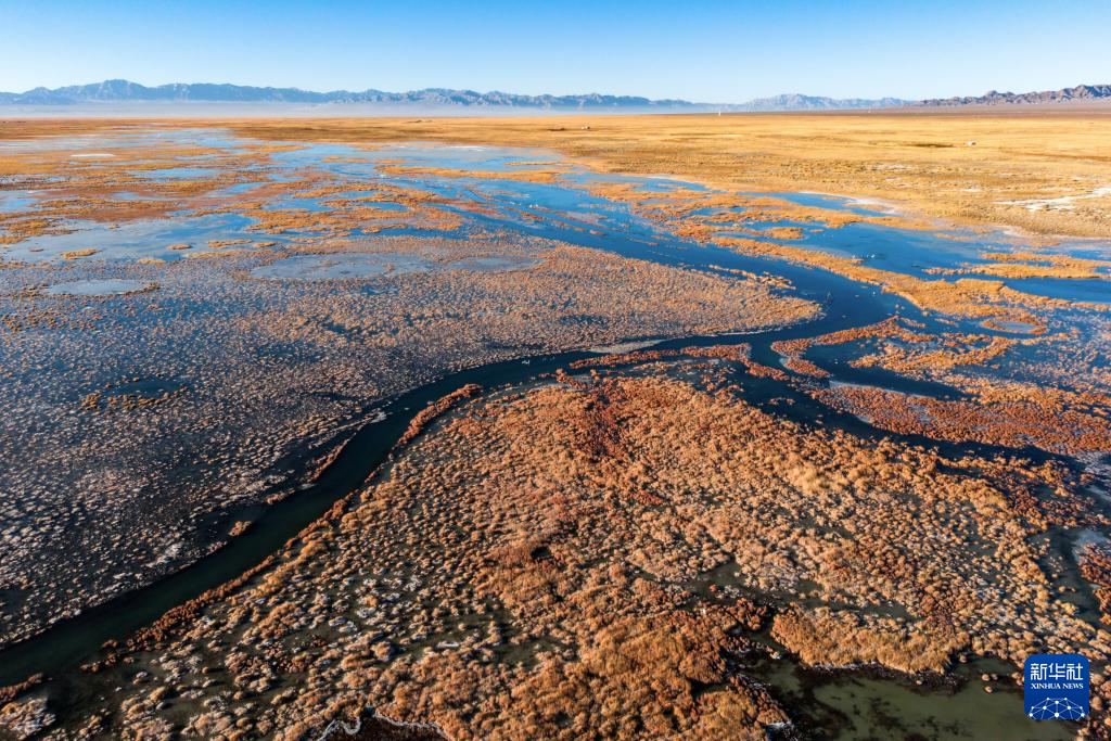 這是11月14日在河西走廊西端的甘肅省阿克塞縣小蘇干湖濕地拍攝的一片水域(無人機照片)。