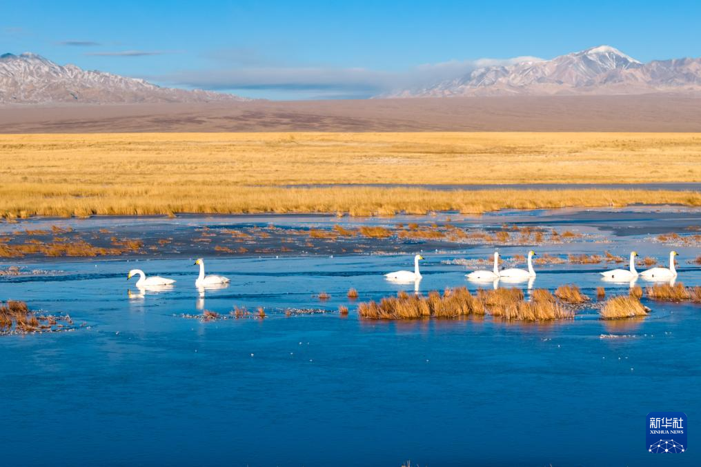 11月14日,在河西走廊西端的甘肅省阿克塞縣小蘇干湖濕地,大天鵝在一處水域游弋覓食(無人機照片)。